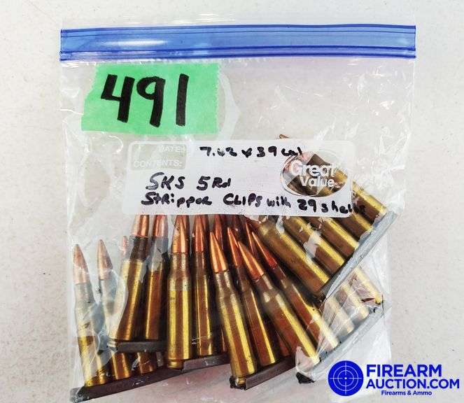 LOT 491 - 7.62 X 39 MM, SKS, (29 Rds) + Stripper Clips (6)